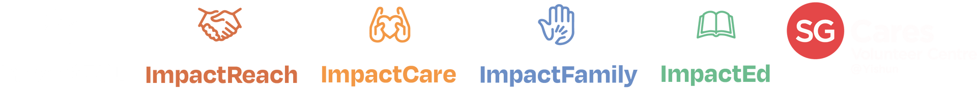 CampusImpact’s programmes are categorised into 6 pillars: ImpactFUL, ImpactReach, ImpactCare, ImpactFamily, ImpactEd and SG Cares Volunteer Centre @ Yishun.